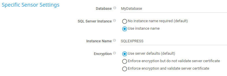 Enter the name of the SQL database to which the sensor connects, for example, MyDatabase. This is a logical entity on the database server where database objects exist.
